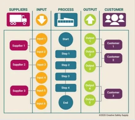 SIPOC: Often referred to as a type of process map it maps out the high-level process steps and considers the Suppliers, Inputs, Process, Outputs, and Customers, providing a complete visualization of the process and the variables needed for the process to work.