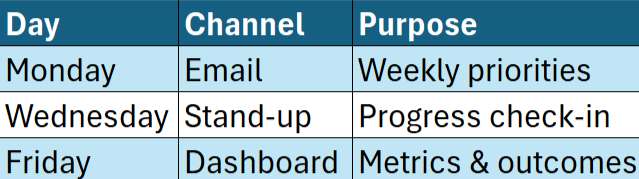 📅 Example 3: Weekly Communication Cadence
