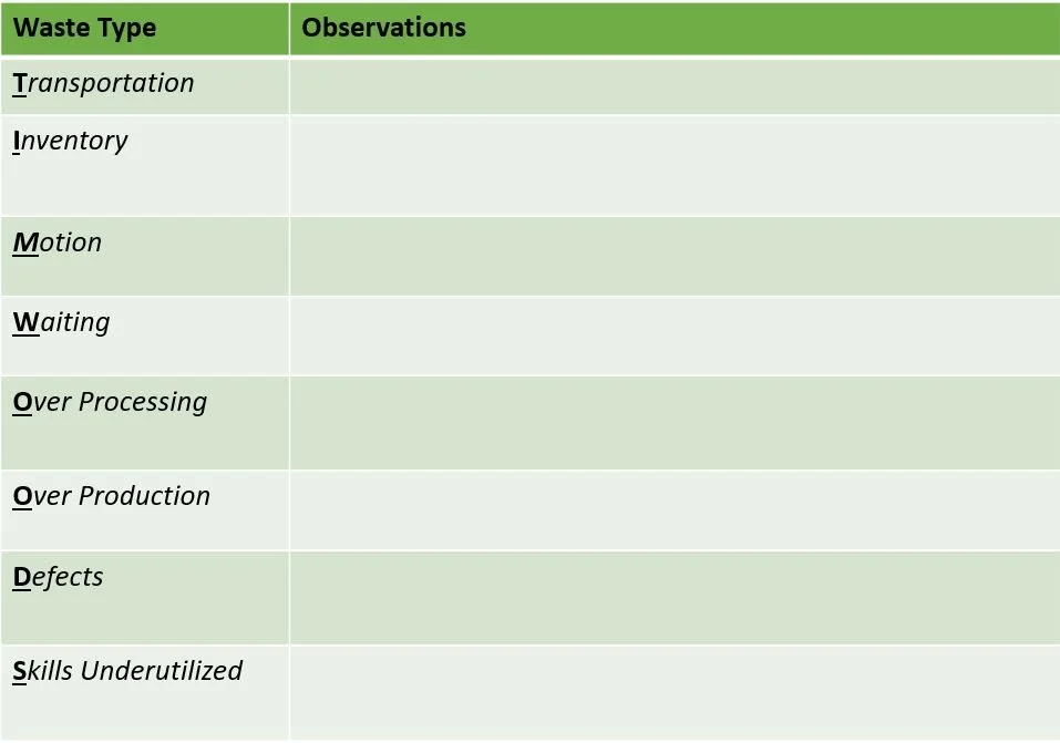 TIMWOODS is an easy-to-remember acronym used to distinguish between the 8 common wastes that occur in a process.